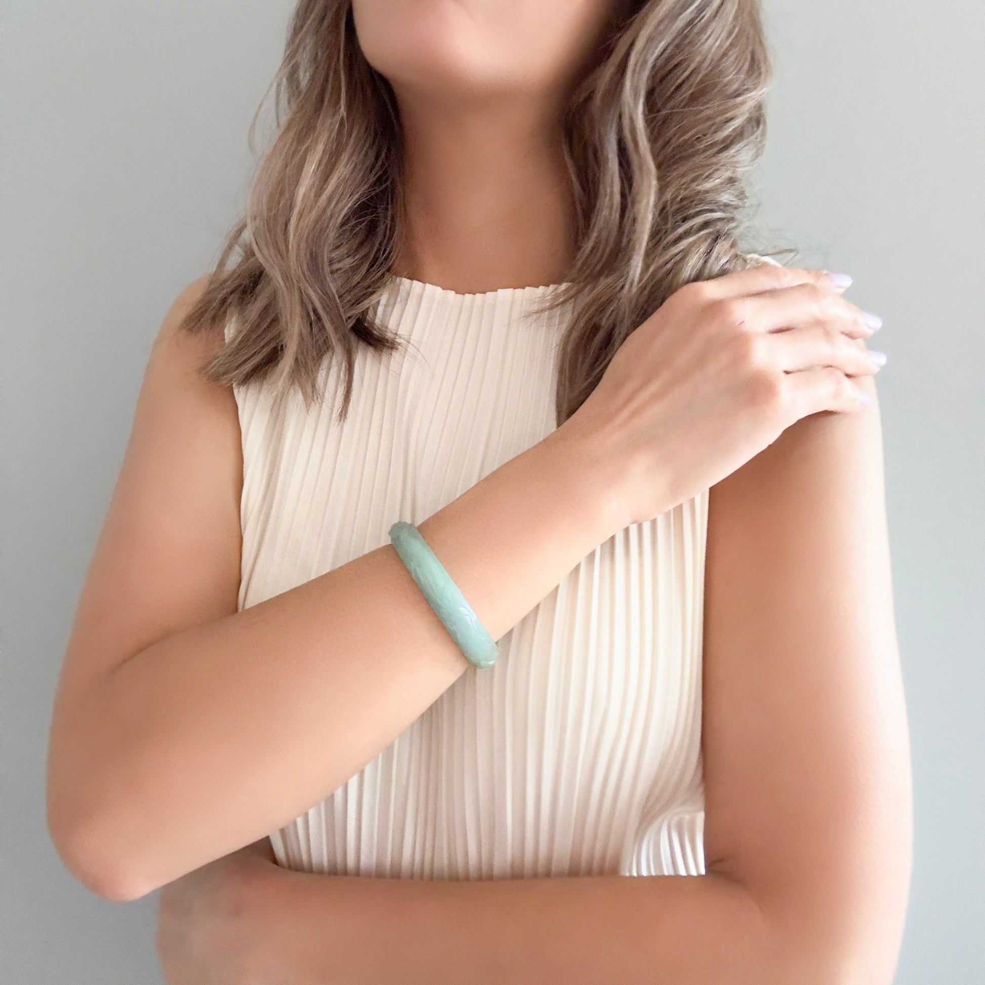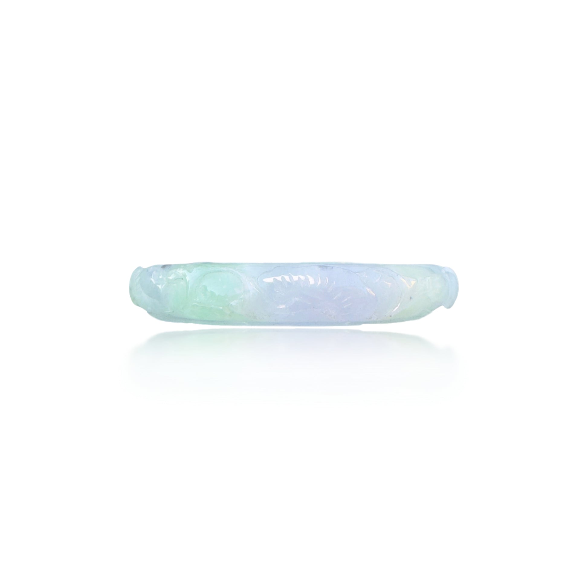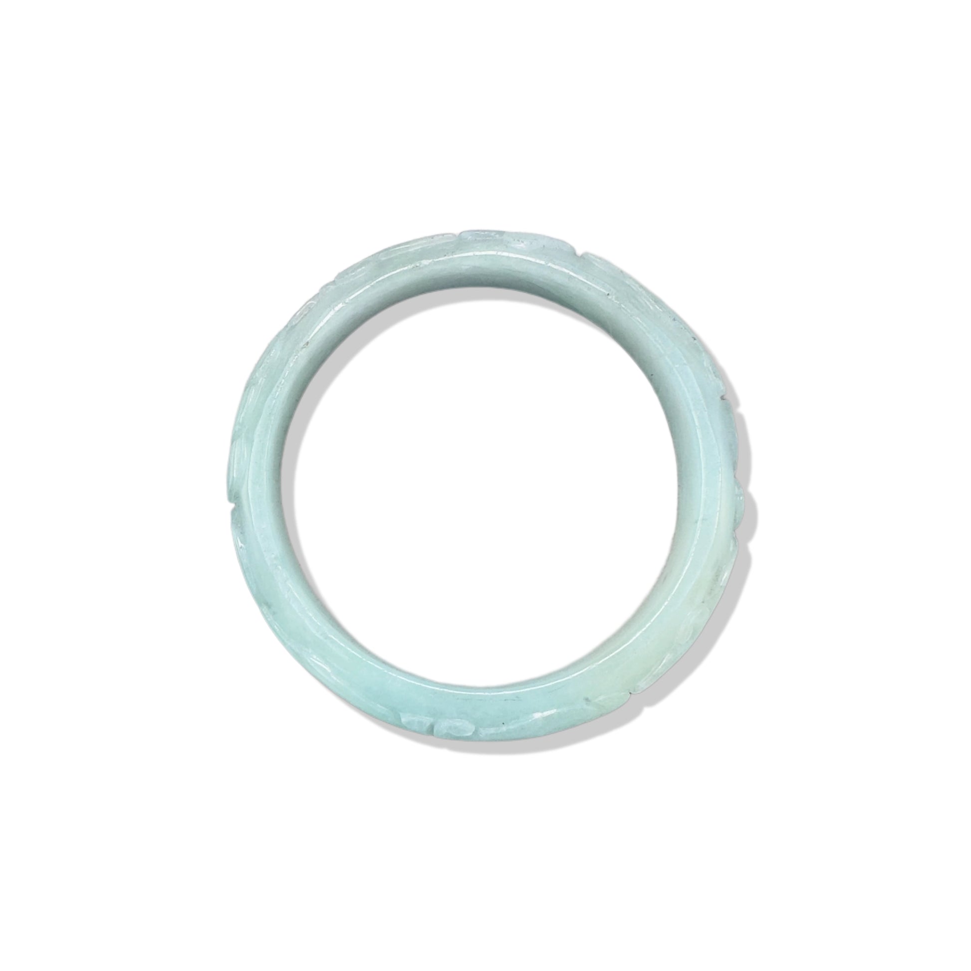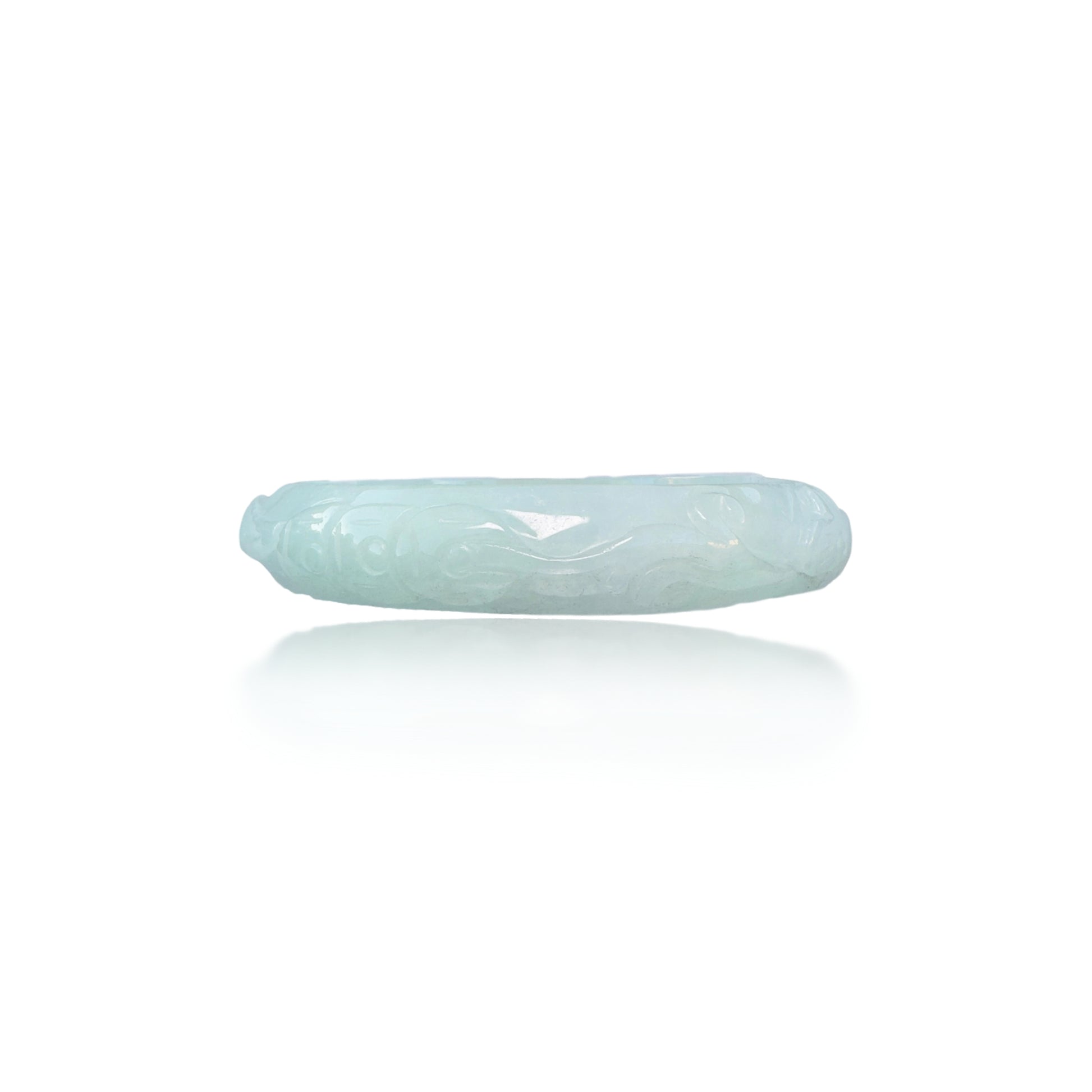 Crafted from Burmese green jade, this exquisite bangle is intricately hand-carved with ancient symbols of prosperity and renewal — money, flowers, and fish — each carrying deep cultural and energetic significance.