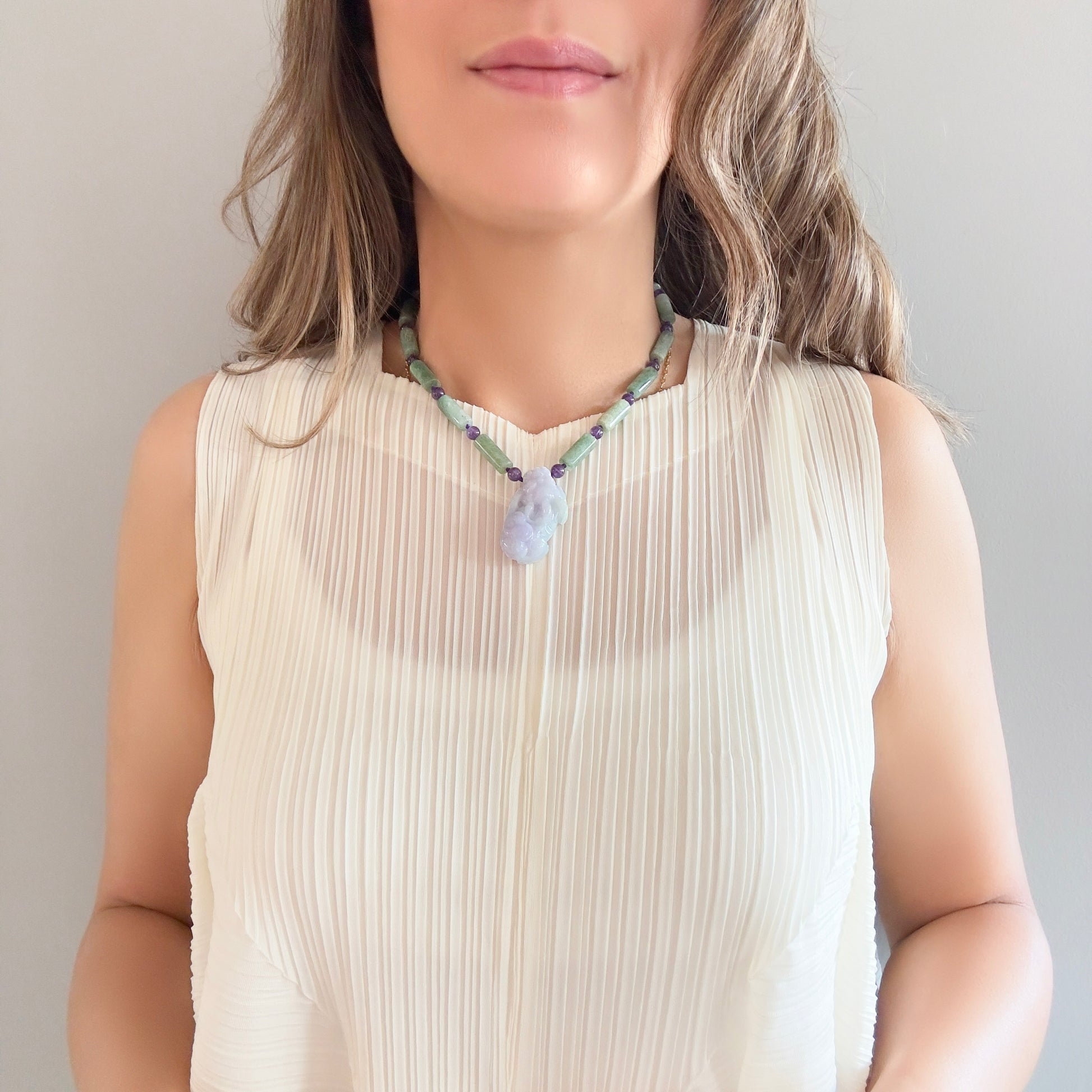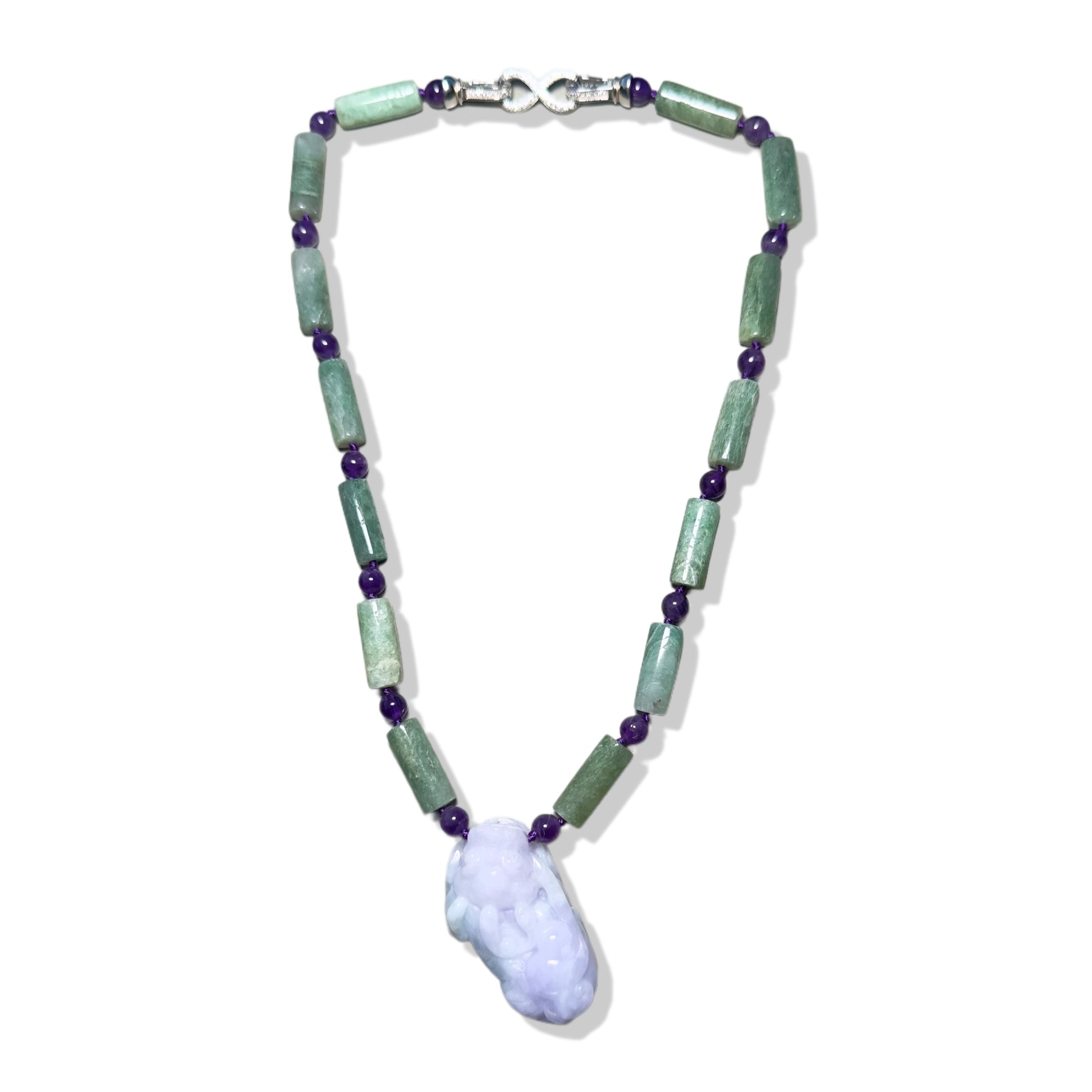 Abundance Necklace with Amethyst and Green Burma Jade Qilin (麒麟) Pendant