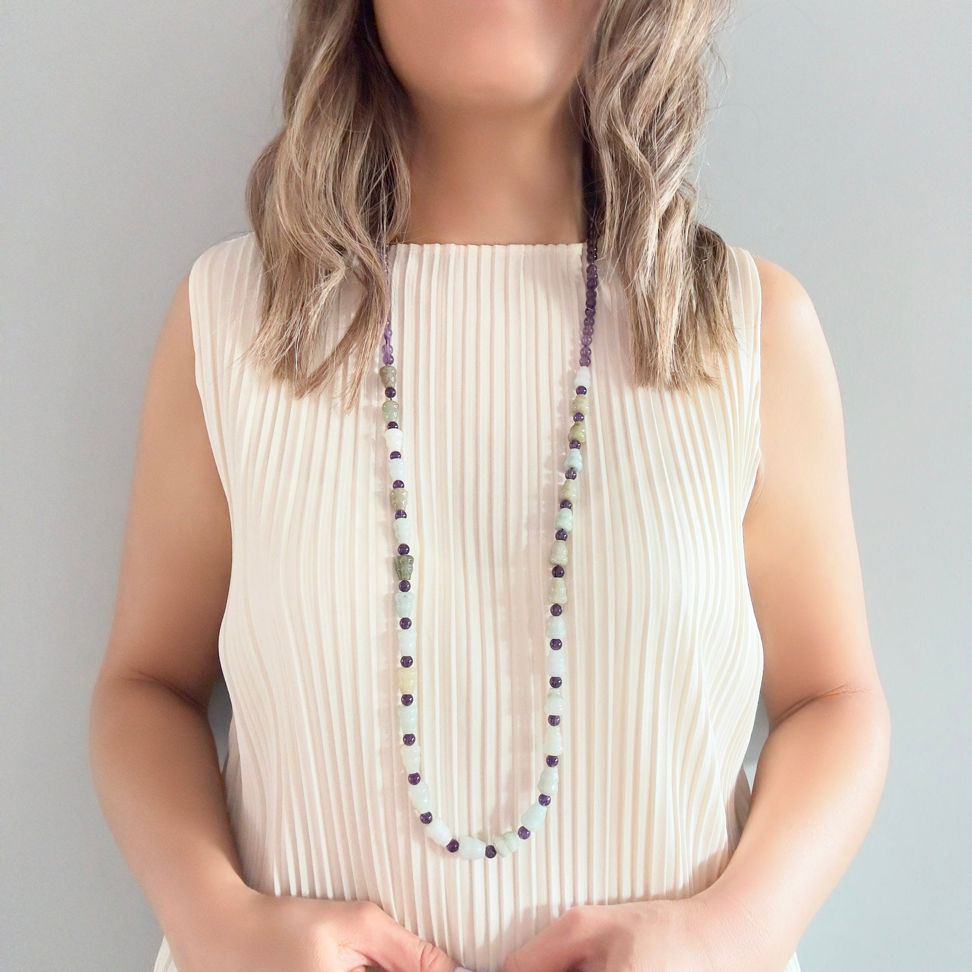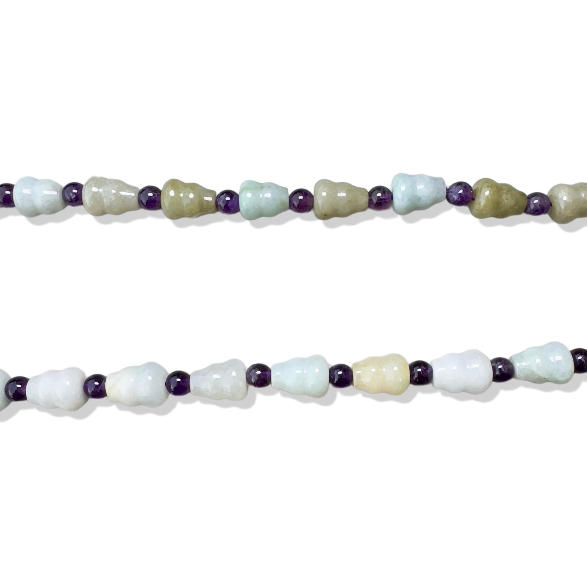 This exquisite amethyst and jade gourd long necklace is not just a stunning piece of jewellery, but also a powerful tool for healing and balance. Featuring a delicate gourd-shaped pendant, crafted from high-quality amethyst and grade A Burma jade, this necklace blends beauty with ancient energy practices.