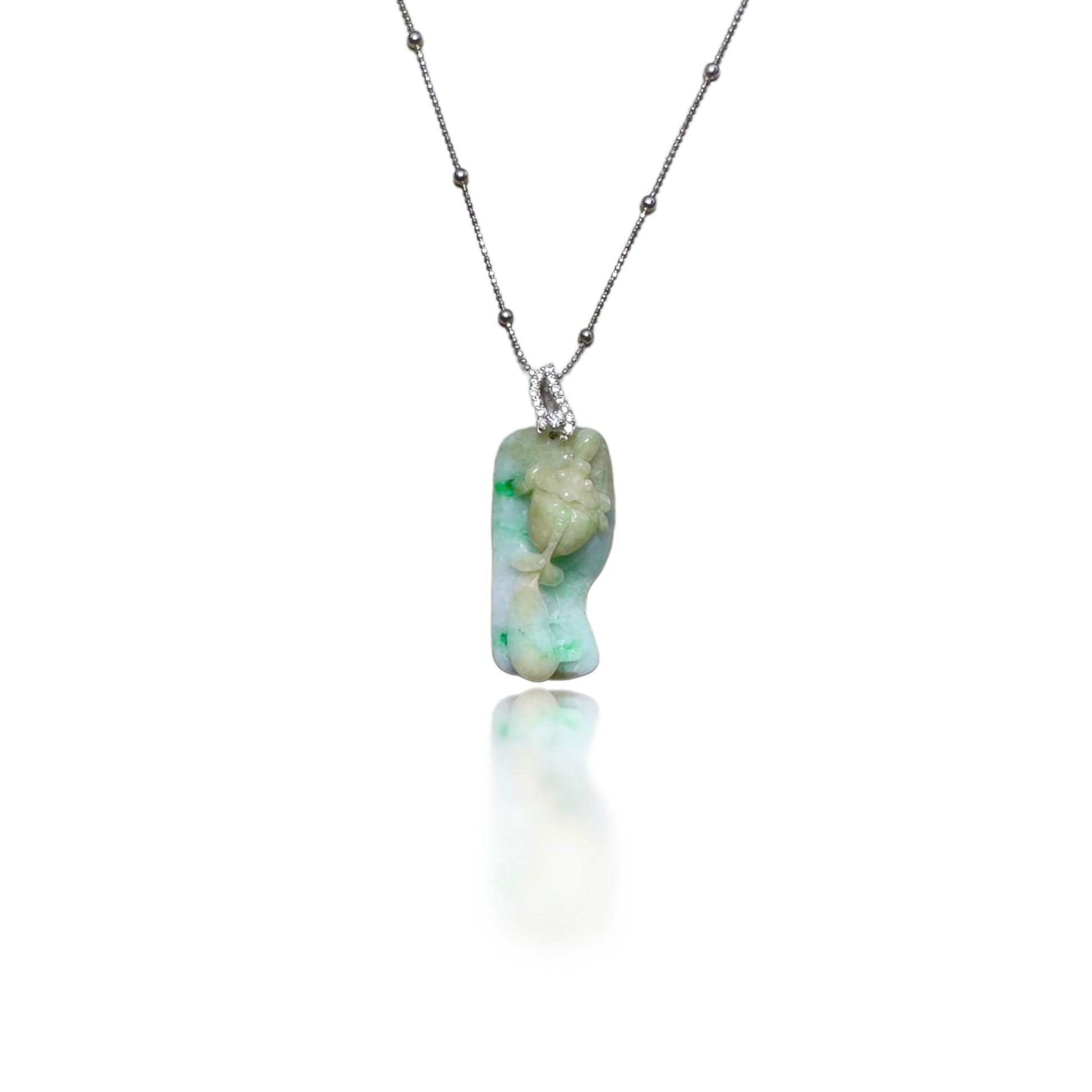 Embrace the healing power of nature with this exquisite green Burma jade goldfish carving sterling silver pendant. Handcrafted with precision, this pendant features a beautifully detailed goldfish, a symbol of prosperity, abundance, and good fortune. The jade, renowned for its calming energy, is sourced from Burma and is revered in many cultures for its therapeutic qualities.
