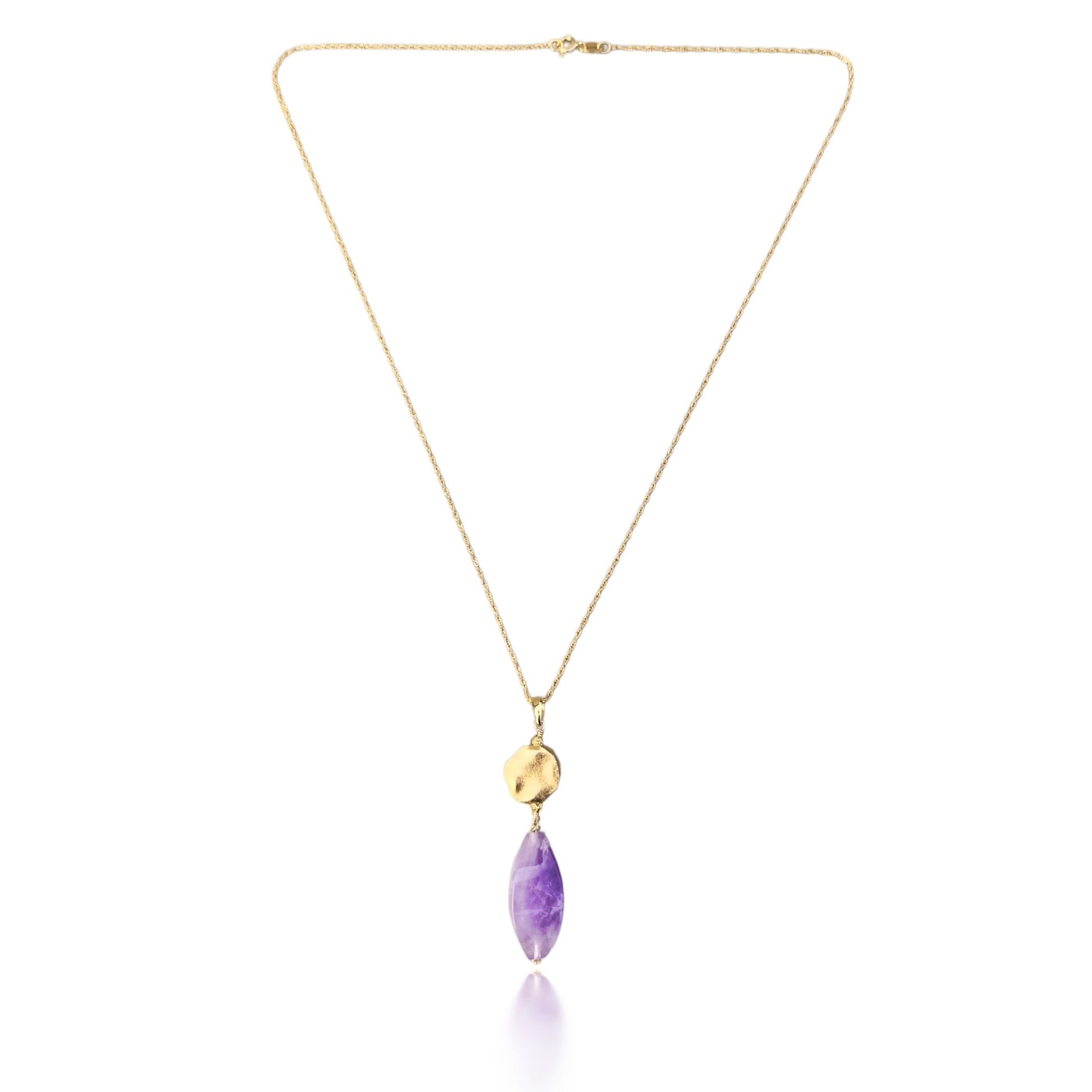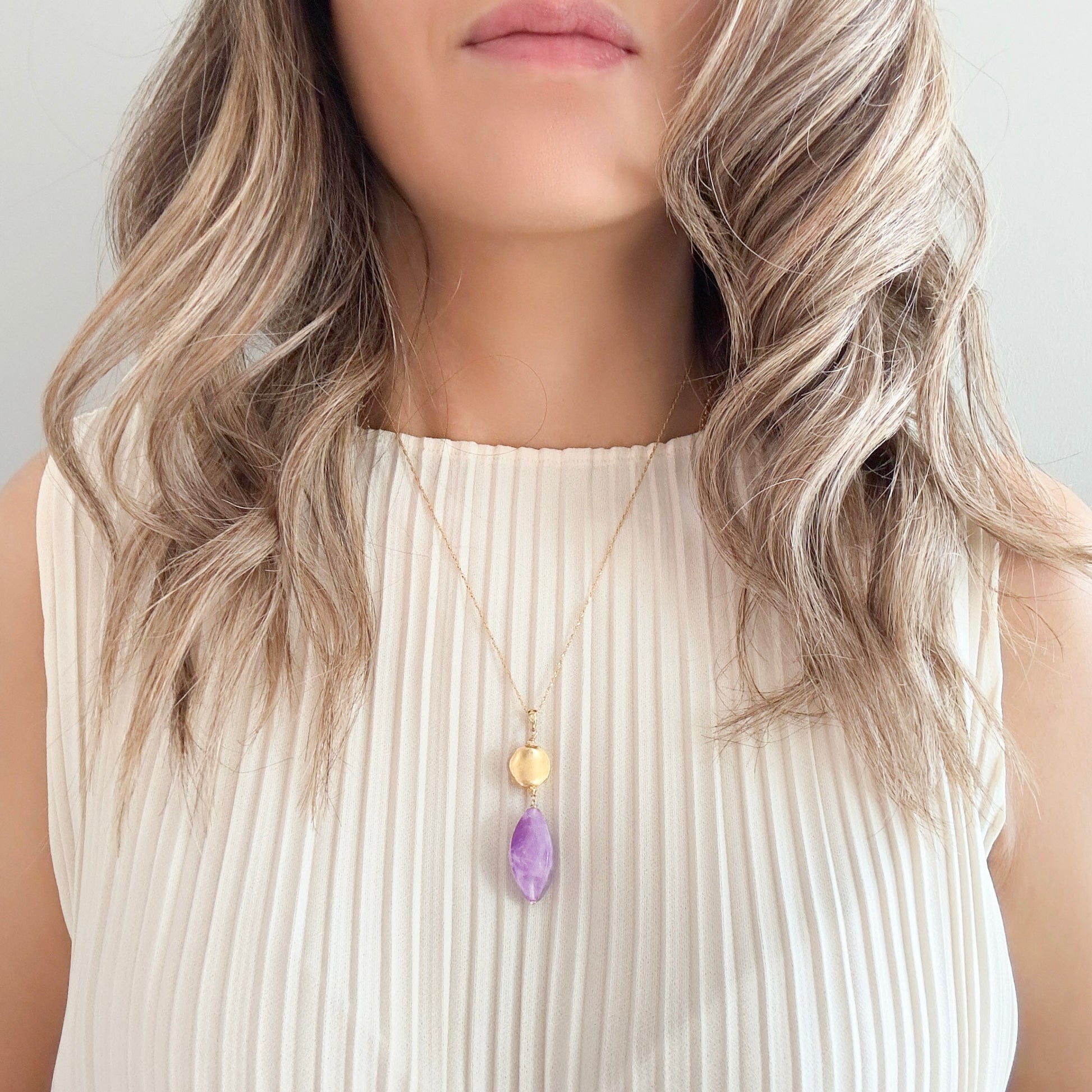 This stunning amethyst and gold pendant is not only a beautiful piece of jewellery but also a powerful tool for healing and spiritual balance. Crafted with a rich purple amethyst, known for its calming and soothing energy, this pendant helps to promote mental clarity, emotional healing, and stress relief.