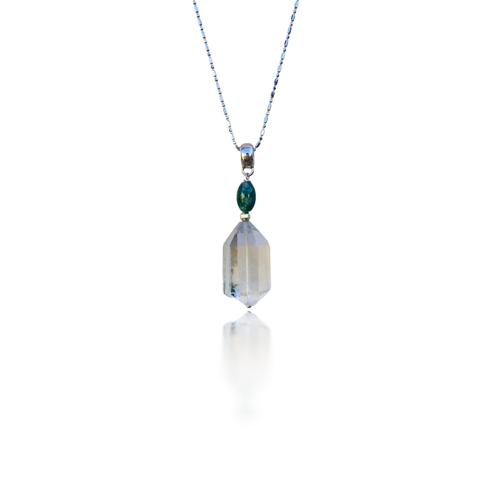 This exquisite pendant combines the natural beauty and healing energy of Green Phantom Quartz and Moss Agate, set in a polished sterling silver design. A powerful symbol of growth, renewal, and connection to the earth, this penda Green Phantom Quartz: This crystal is known for its profound healing energy, particularly in emotional and physical healing.