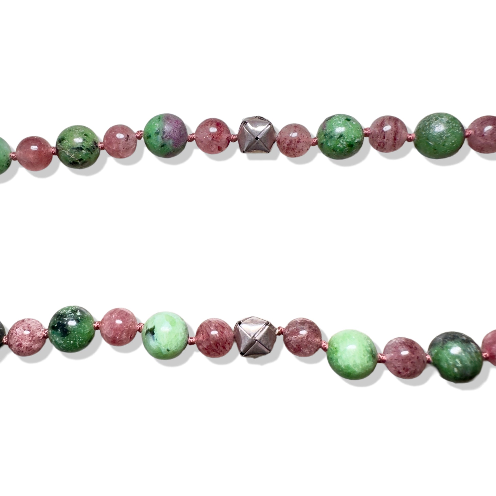 This exquisite long necklace combines the powerful healing energies of ruby zoisite, strawberry quartz and pure silver, offering both beauty and balance. The handpicked gemstones, paired with a delicately crafted pure silver double fish pendant, create a harmonising energy to support emotional healing and personal growth.