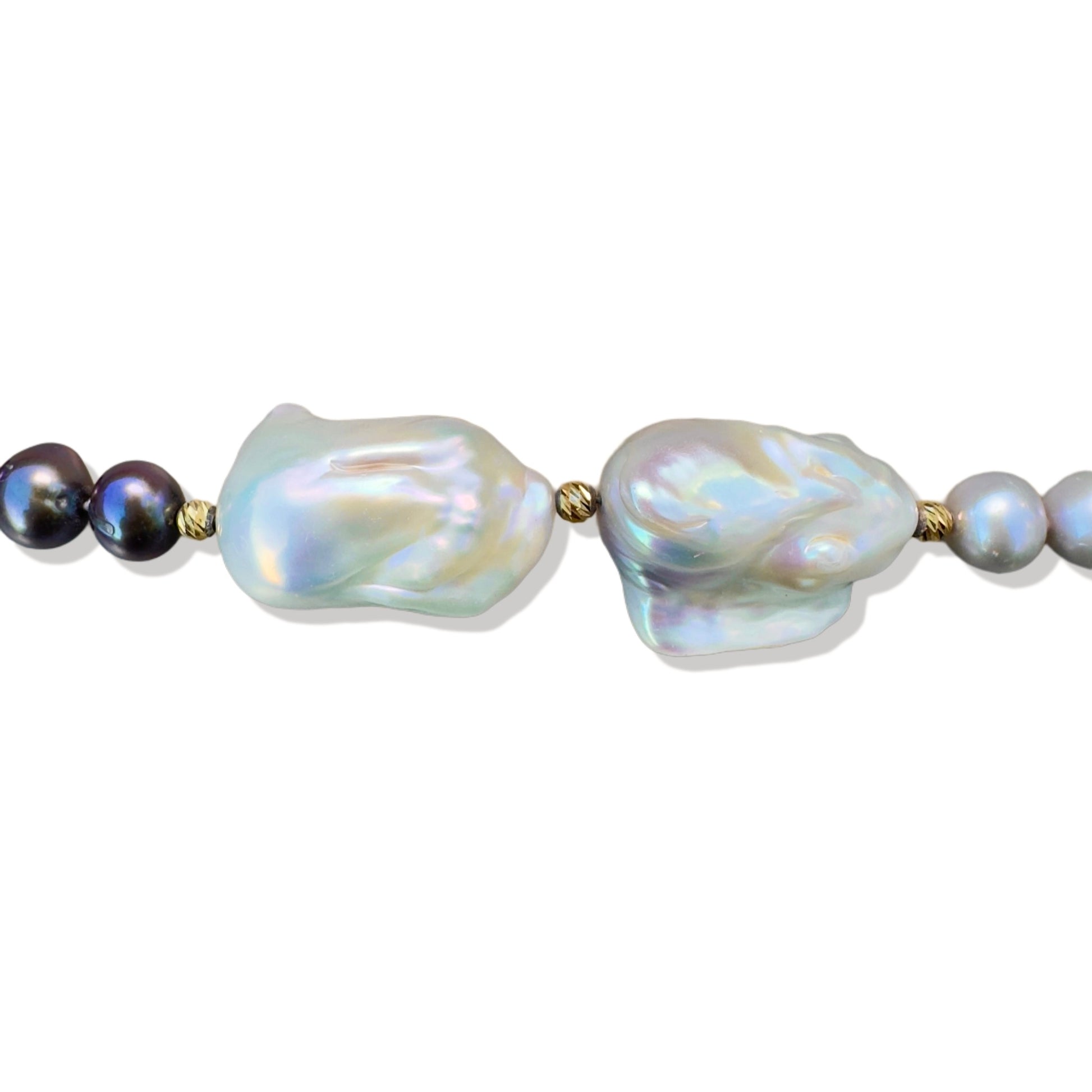 Embrace balance and inner peace with this stunning handcrafted necklace, featuring luminous white baroque pearls paired with mysterious peacock pearls. Each uniquely shaped pearl is a symbol of natural beauty, imperfection, and individuality—reminding you to honour your own path and truth.