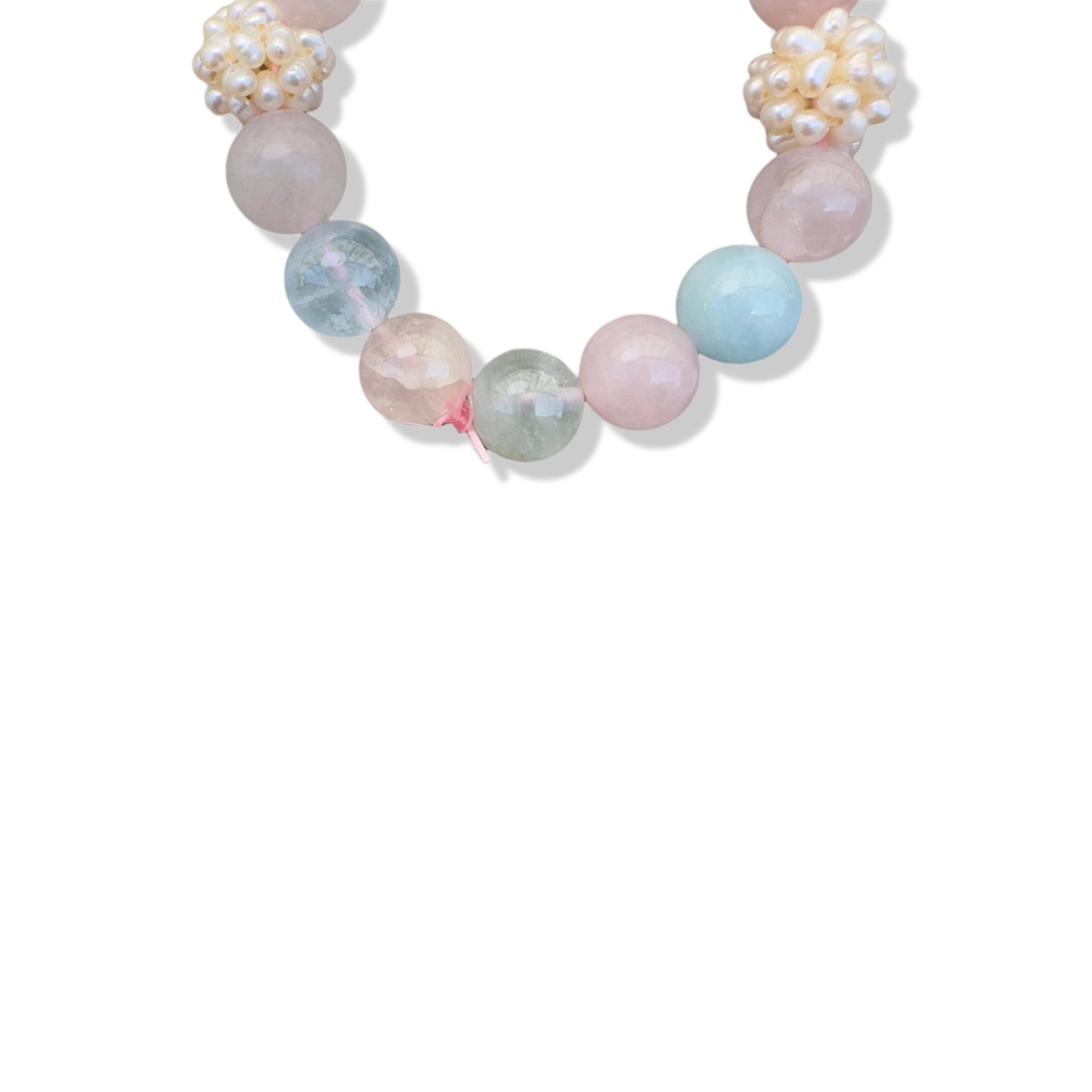 Featuring a captivating array of pastel-toned beryl stones—such as aquamarine, morganite and emerald —paired with luminous, freshwater pearls cluster, this bracelet is designed to inspire inner peace and emotional balance.