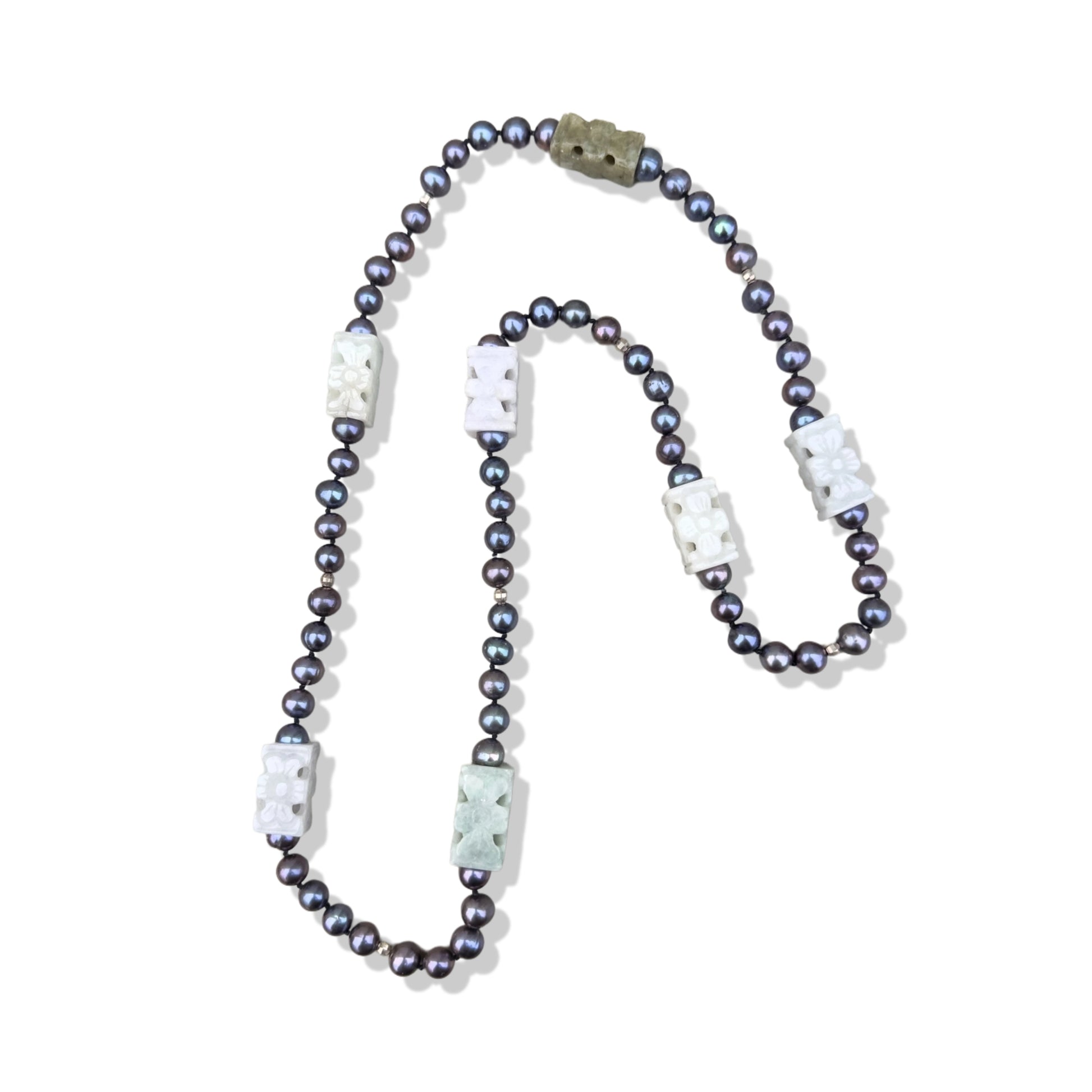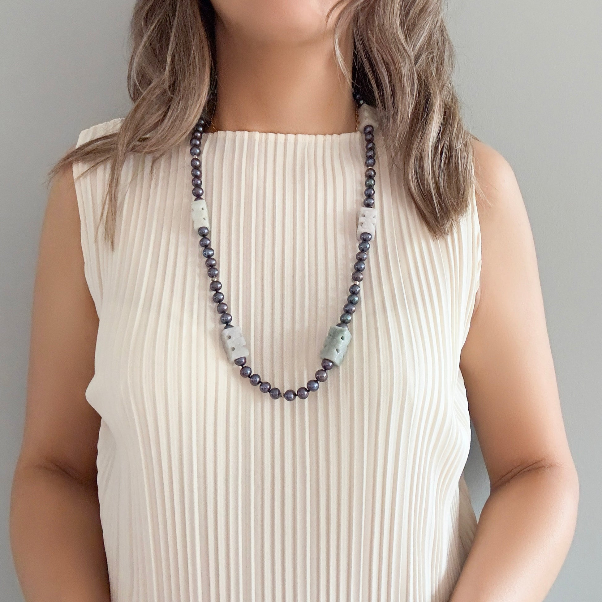This exquisite long necklace combines the natural beauty of peacock freshwater pearls with the ancient healing power of Burma jade carvings. Each bead has been carefully selected to harness the unique energetic properties of both the pearls and the jade, making it a powerful piece for both aesthetic appreciation and personal wellness.