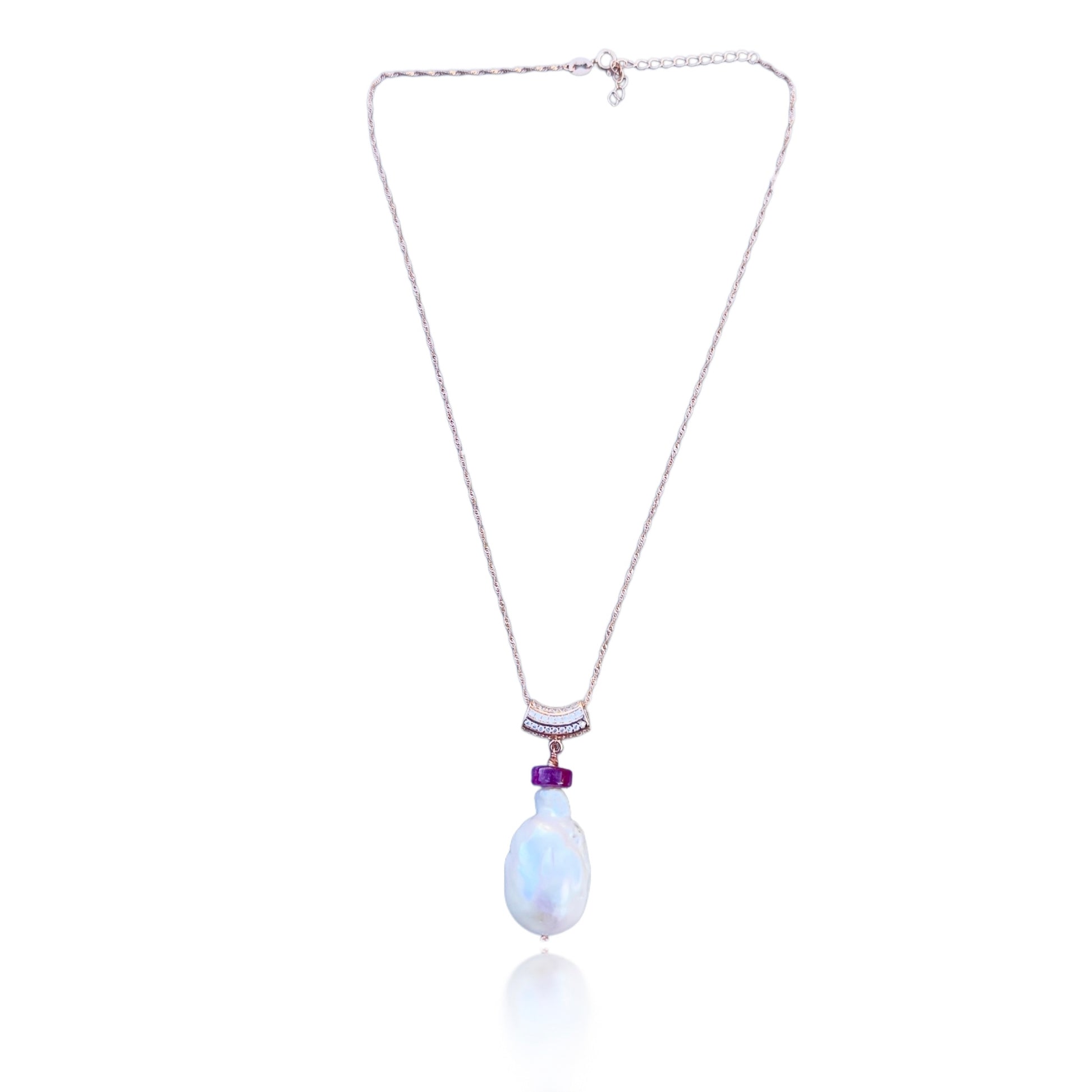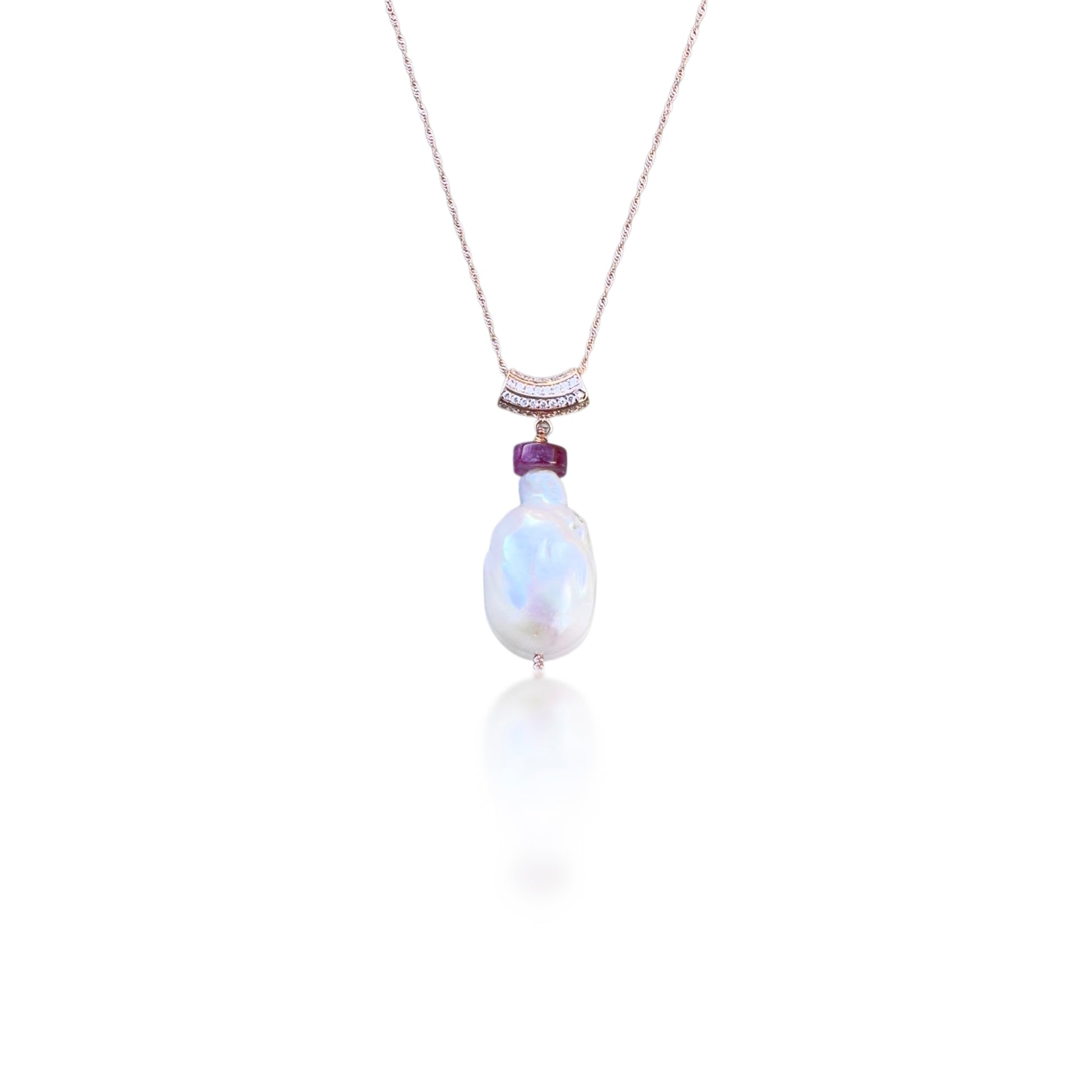 Inner Peace Pendant with White Baroque Pearl, Pink Tourmaline and Rose Gold
