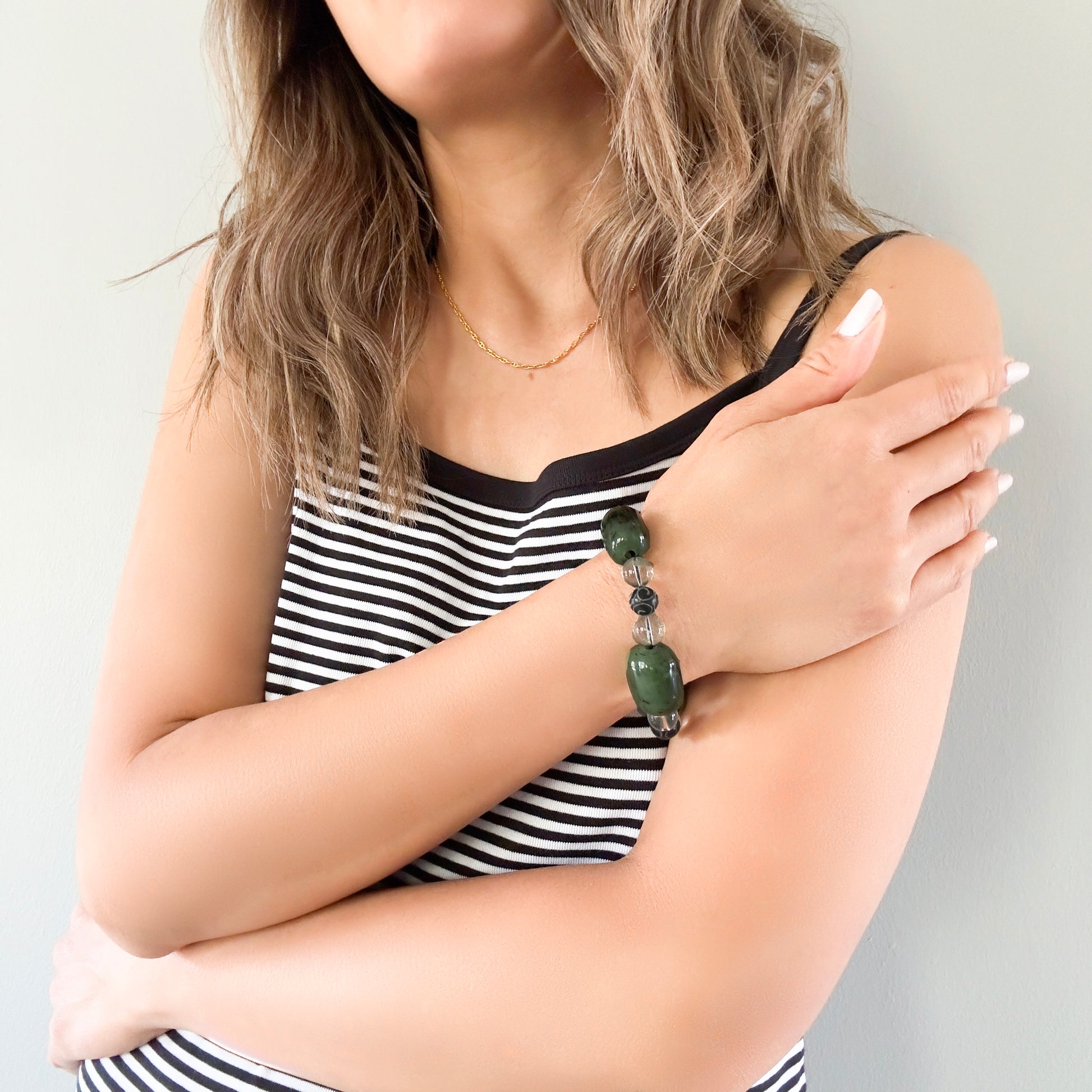 A beautifully crafted piece designed to inspire healing and balance, this bracelet combines the powerful energies of maw sit sit, green phantom quartz, and antique jasper. Each stone is handpicked for its unique healing properties, creating a harmonious energy that supports emotional wellbeing, transformation, and physical vitality.