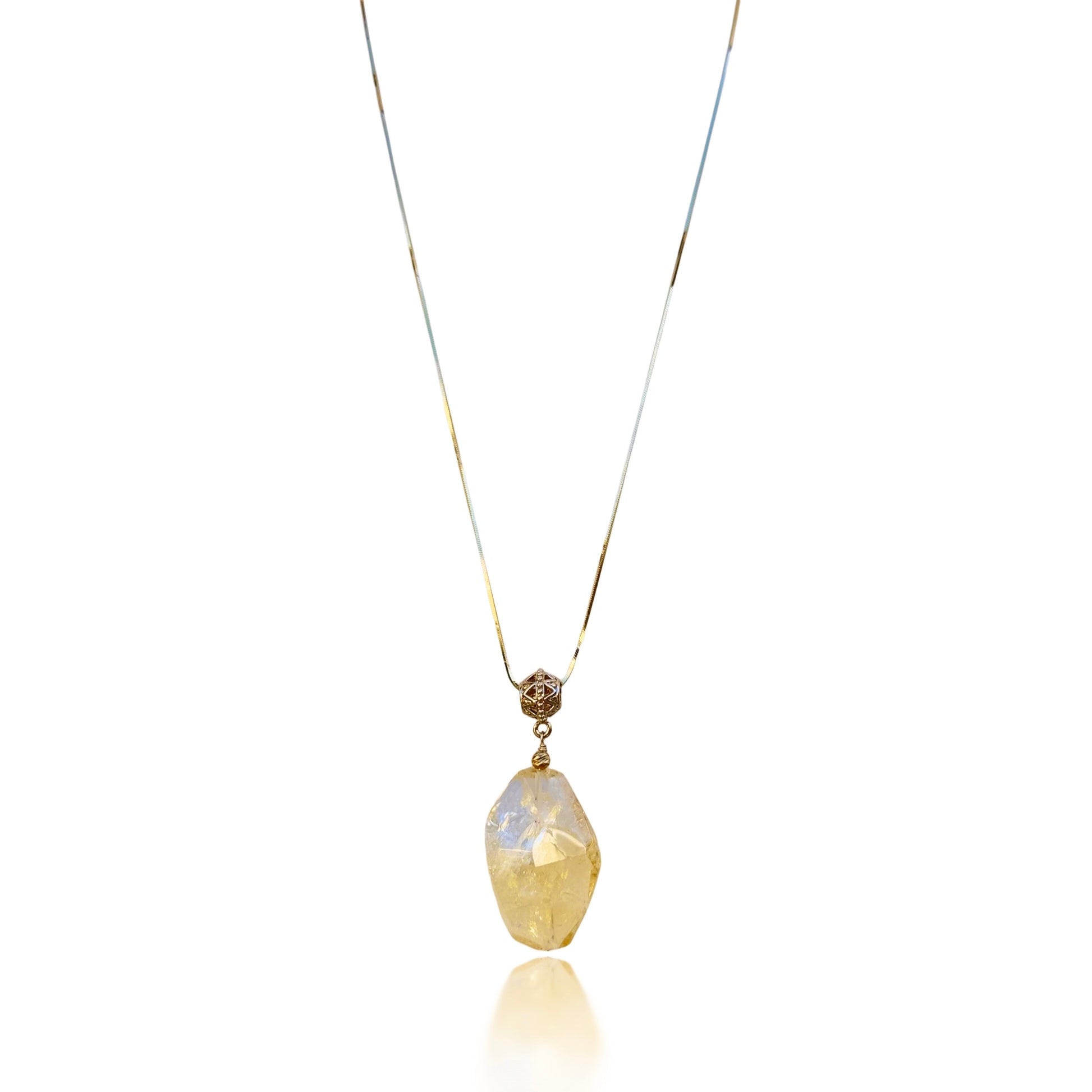This joy pendant necklace is a unique blend of nature's elegance and healing energies, crafted with natural citrine and yellow gold. The pendant is designed to inspire balance, peace, and emotional healing.