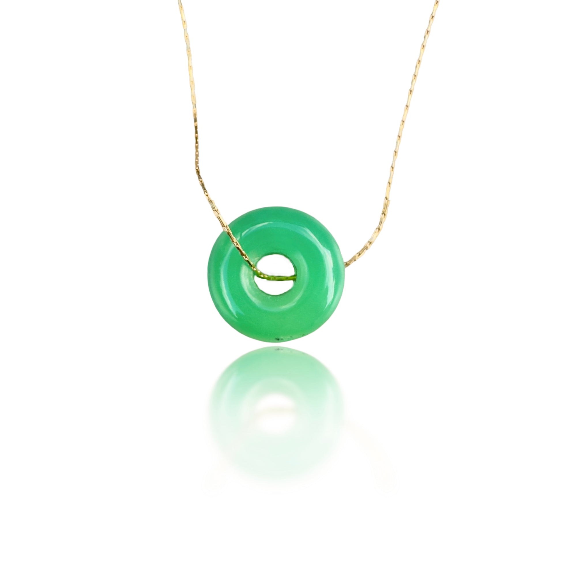 The chrysoprase donut, with its continuous, unbroken circle, symbolises eternity and the flow of positive energy. Whether worn as a daily reminder of self-love or as a tool for deeper meditation, this pendant encourages harmony between the heart and mind. Paired with the timeless elegance of yellow gold, this piece is designed to bring both beauty and balance into your life.