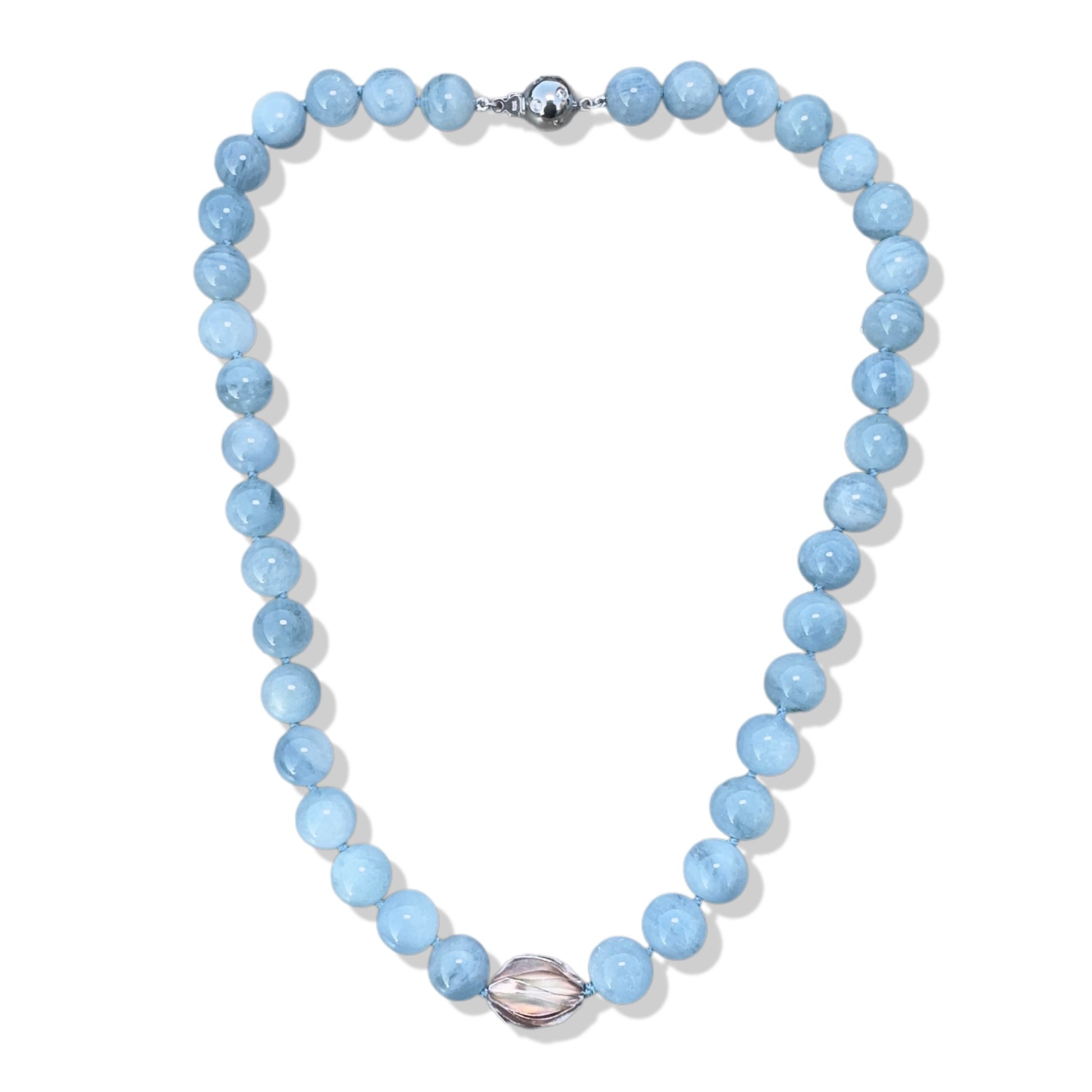 Perfect for everyday wear or special occasions, the aquamarine and pure silver bead necklace combines elegance with meaningful energy. Strung and knotted on silk thread, it makes a thoughtful gift for anyone seeking balance, harmony, and a connection to nature's beauty.
